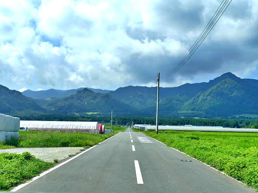 阿蘇長陽大橋展望所を出発したらさらに先へ進んで、途中からは南阿蘇村の田園の中の真っ直ぐに伸びる道を西に向かって走りました。正面に見える山(外輪山)の向こうにはこれから向かう西原村があります。