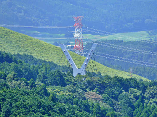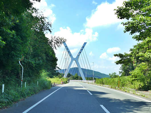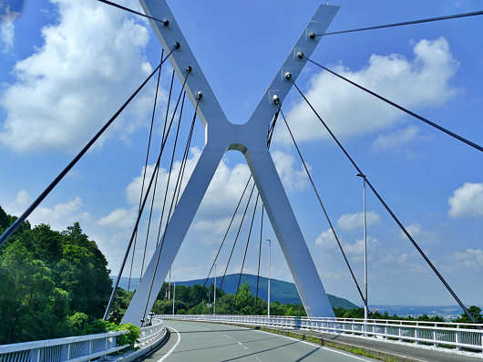 ここにあるのは正式名称を「桑鶴大橋(くわつるおおはし)」といって、この巨大なX型の構造物は吊橋の一種の斜張橋の支柱です。斜張橋自体は珍しい吊橋じゃありませんが、多くの吊橋は支柱がH型のように真っすぐに伸びていて、支柱がX型をしている吊橋はここ以外では見たことがないので、九州では珍しい吊橋じゃないでしょうか?
