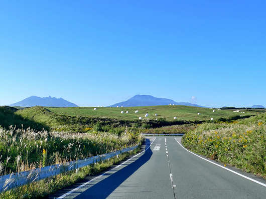 カーブに差し掛かると正面には北外輪山が見えて、阿蘇火山の巨大カルデラを実感できる眺望の素晴らしい道路なんですよね。