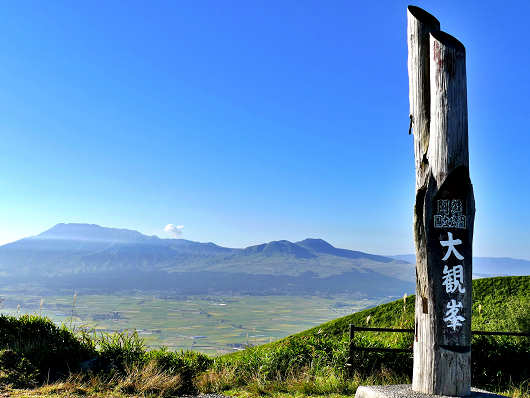 途中からやまなみハイウェイをわずかな区間だけ走って、阿蘇北外輪山へと向かう道へ左折してしばらくすると、外輪山一の絶景といわれる「大観峰」に到着しました。