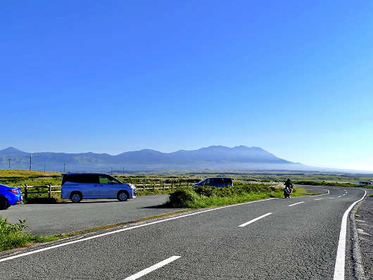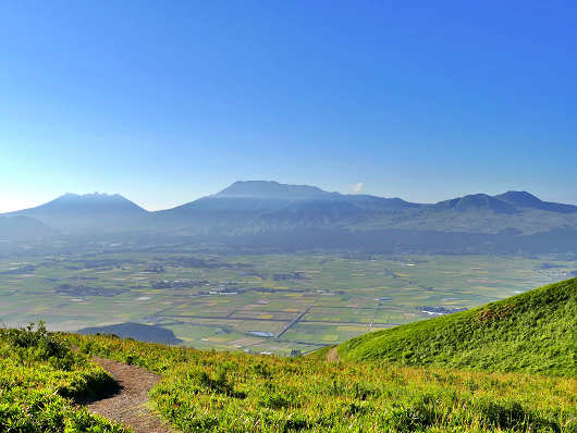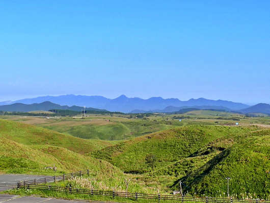 そしてこちらはこれから向かう菊池市方面の景色です。画像ではちょっと分かりませんが、草原の中には北外輪山の稜線を走っている「ミルクロード」も見えました。