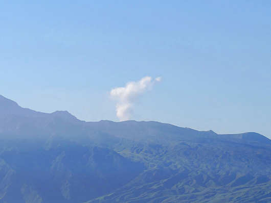 阿蘇中岳を眺めると水蒸気でしょうか?真っ白い煙らしきものがモクモクと湧き上るのが見えました。