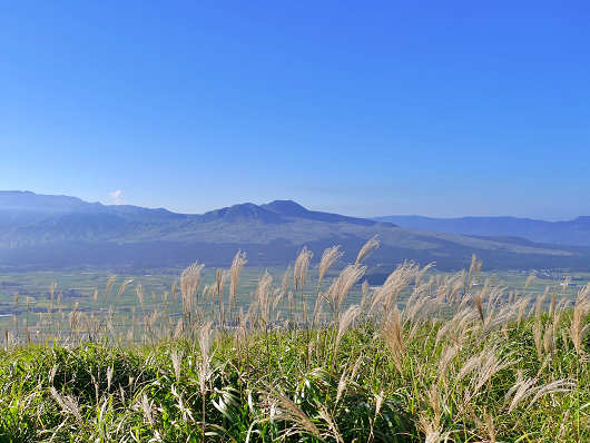 ゲートよりも手前の駐車場に車を停めて阿蘇盆地の方角を眺めると、ススキの穂の向こうに阿蘇山が見えました。秋らしい景色ですが、最近は急に寒さが増してきたので、高原のこの辺りでは秋を通り越して一気に冬がやって来そうな予感ですね。