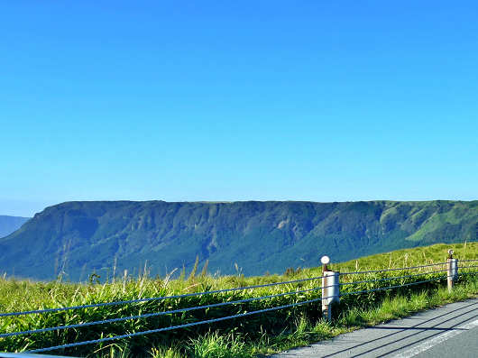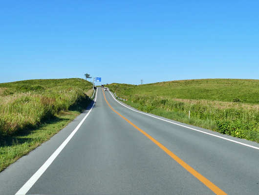 国道57号は熊本県へ入ると、周囲に樹木が繁った眺望の効かない道になりますが、県道40号へ右折すると景色は一変して、周囲には草原が広がって正面には阿蘇五岳が見えてくる快適な道路となります。