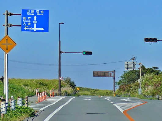 しばらくするとこの辺りでは唯一の信号機がある交差点に出ました。ミルクロードはこの交差点を左折して大津町へと続き、ここを右折するとマゼノミステリーロードを走って南小国町へと続いていますが、これから向かうのはここを直進した菊池阿蘇スカイラインです。いずれの道もここから先は北外輪山の稜線を下る坂道となります。