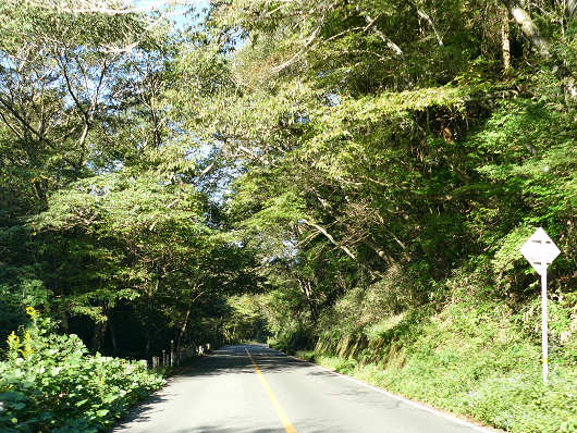 菊池阿蘇スカイラインへ入ると、これまでの草原を走る眺望抜群な道路から一変して、樹木が道路上に覆いかぶさるように繁った眺望の効かない道路になります。