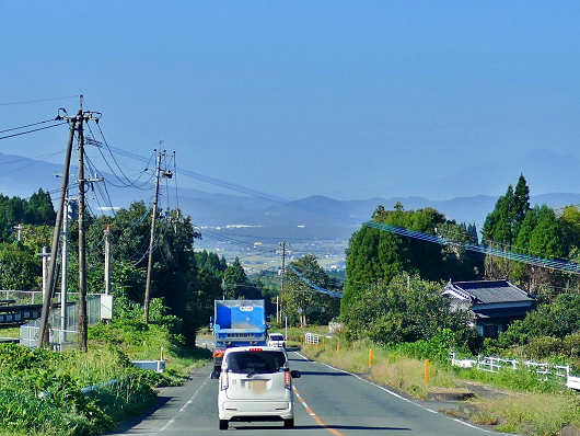 しばらく眺望の効かないクネクネの下り坂を走っていると、視界が開けて正面に平地が見えてきました。ここがこれから訪れる目的地がある、熊本市北部から菊池市、山鹿市にかけての菊池川中流域に広がる菊鹿盆地(きくかぼんち)です。