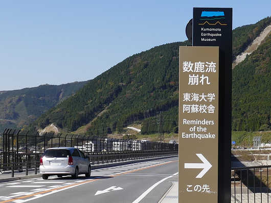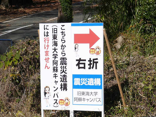 ここにはこの様な標識が立てられていて、国道57号から新阿蘇大橋を渡って左折すれば、震災遺構となっている東海大学阿蘇校舎へ行けます。