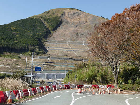 この道路は左折するとすぐに「数鹿流崩之碑展望所」が正面に見える対岸へと出ますが、ここはかつて阿蘇大橋が架かっていたところで、車止めのバリケードのすぐ向こうには、崩落した阿蘇大橋の一部が岩壁にぶら下がって残っているところです。