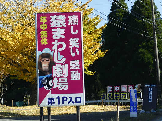 迂回路の県道149号から県道298号へと大回りをして、阿蘇猿まわし劇場の前を通って東海大学阿蘇キャンパスを目指しました。でも猿まわし劇場の大きな看板には年中無休と書かれているのに、その右下には小さな文字で本日休演日と書かれていました(笑)