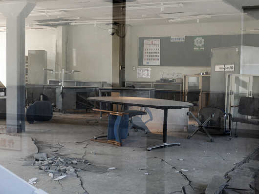 ここは熊本地震で大きな被害を受けて、当時の状態をそのまま残した震災遺構として一般に公開されています。校舎内も倒れたイスやコンクリート床の亀裂など当時のままで保存されていて、ここへ来ると熊本地震から時が止まったままのような感じがします。