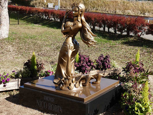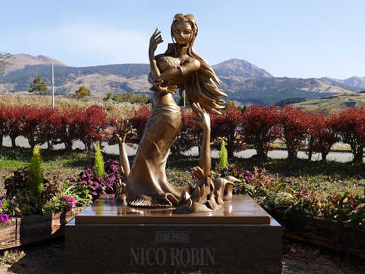 今回見物したニコ・ロビン像は、JR阿蘇駅前に設置されているウソップ像に続いて2体目の見物になりますが、この近くでは南阿蘇鉄道の高森駅前に、船大工のフランキー像が設置されているので、今回はこの像も見物する予定です。そしてその他にも益城町や西原村などにも像が設置されているので、次に阿蘇市方面を訪れた時には寄ってみたいですね。熊本復興プロジェクトの「麦わらの一味 ヒノ国復興編」では、現在9体目となる銅像を12月中に大津町へ設置する予定だそうです。