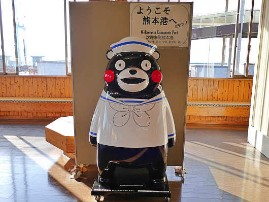 乗船手続きを済ませたらすぐに車へ戻らないといけないので、待合室に立っていたセーラー姿のくまモンを撮影しただけです(笑)