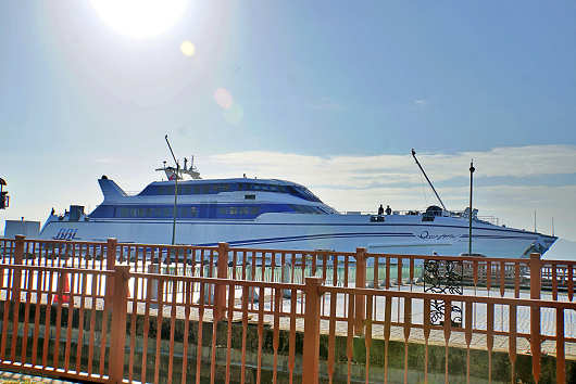 乗船手続きを済ませて大急ぎで車へ戻ったら、岸壁にはすでにこれから乗り込む高速フェリーのオーシャン アローが着岸していました。オーシャンアローは総トン数が1678tで全長が72.1mと、あまり大きなフェリーではありませんが、双胴船で速力が30ノットの高速フェリーです。