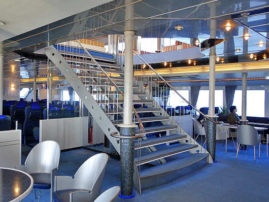 オーシャンアローの船内は3層に分かれていて、最下層が車両甲板で、その上に2層の客室がある構造なので、客室の中央部には上層階への階段があって、階段の向こう側にはズラリとイスが並んだ客席や、窓際にはテーブル付きの客席もあります。