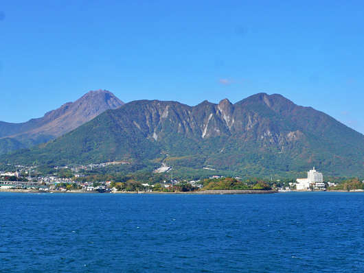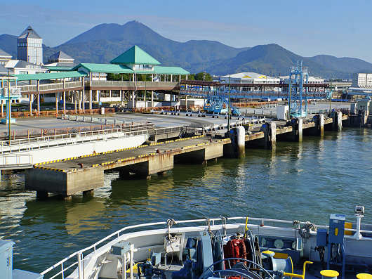 船内には修学旅行の小学生が多く乗っていて、とても騒がしかったのであまりゆっくりできませんでしたが、20分もすると前方に島原半島の山々がくっきりと見えてきました。手前にそびえるのが「眉山」で、その後ろに見えるのは、30年ほど前の雲仙普賢岳の大噴火によって形成された「平成新山」でしょうか? オーシャンアローは間もなく島原外港へ到着するので、数枚の写真を撮ったら大急ぎで車へと戻りました。