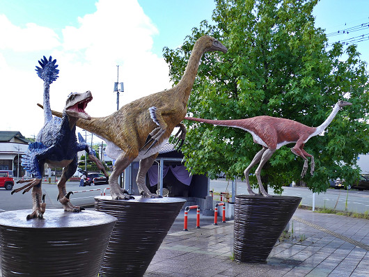 御船町の新市街地と旧市街ちを結ぶシンボルロードと呼ばれる道路沿いには、化石のモニュメントだけじゃなくて、リアルな恐竜のモニュメントもあって、これはエルリコサウルス、ヴェロキラプトル、アーケオルニトミムスです。