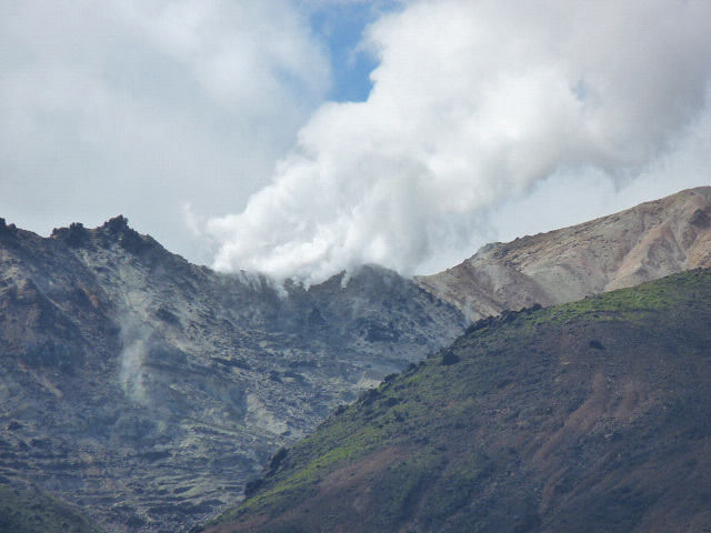 白煙を上げる山は久住連山のひとつ硫黄山だよ。