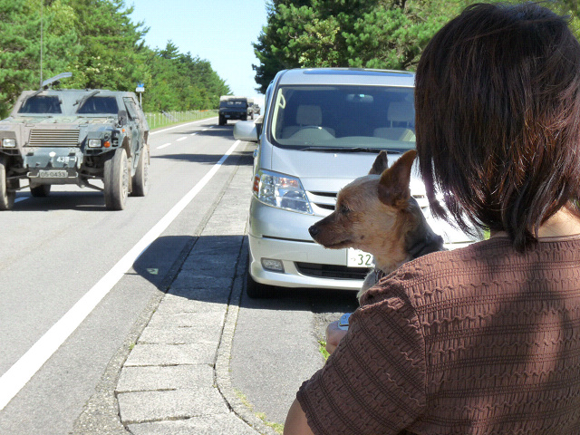 この日は自衛隊の車がたくさん通っていて、りゅう君も装甲車を見ています。
