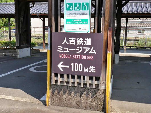 ミニトレインのレールはどこから伸びているのかと後ろを見たら、人吉鉄道ミュージアムの建物の中から続いていました。ここは正式名称は「人吉鉄道ミュージアム MOZOCAステーション868」というそうです。「868」については調べてもよく分かりませんでしたが、ここの郵便番号の最初の3桁が「868」でした。