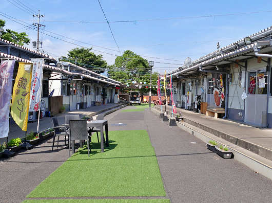 ズラリと並んだ建物の入口には「モゾカタウン」と書かれた看板があって、これを見るとここには24店舗もの飲食店を中心としたお店が入っているようでした。この時は熊本地震の直後に造られた仮設店舗の復興マーケットとよく似ているなと思っていましたが、帰ってから調べたら平成2年の豪雨災害で被害を受けた飲食店などのための仮設店舗でした。この時の豪雨では球磨川が氾濫して人吉市では甚大な被害が出ましたからね。
