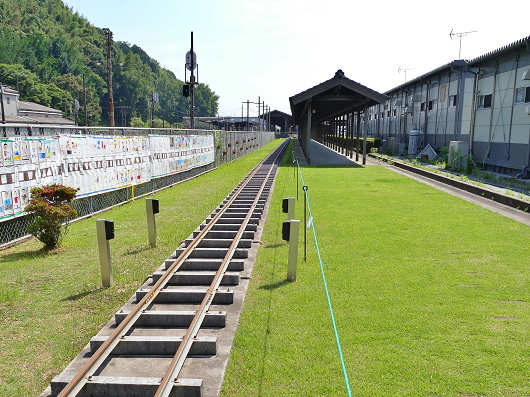 モゾカタウンの仮設店舗とJR肥薩線のレールの間には人吉駅までミニトレインのレールが敷かれていました。そして左側のフェンスには市内の16保育園の園児が書いた鉄道を応援する絵が横断幕に描かれていました。