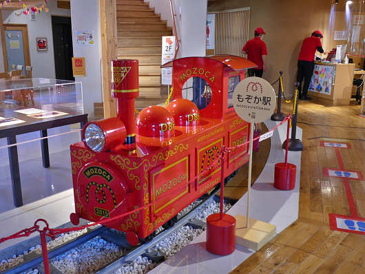 そしてミニトレインが停車していて「もぞか駅」と書かれた駅名標もありました。このミニトレインは乗車料金が200円だそうです。