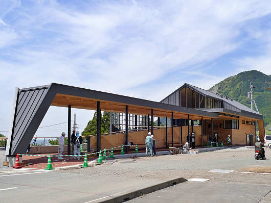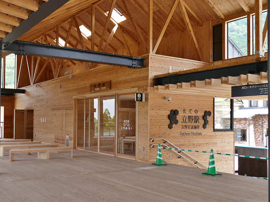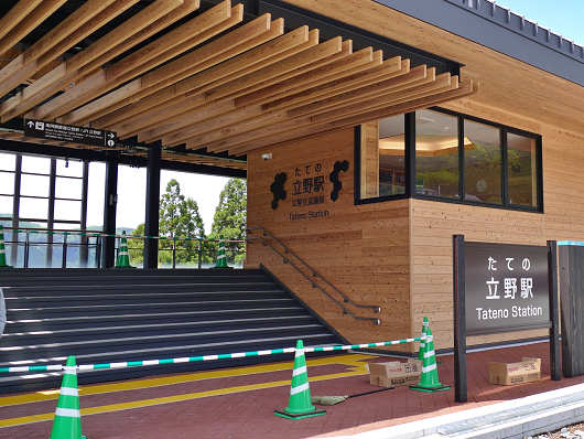 立野ダム展望所から立野駅まではわずか300mほどの距離ですが、今年の1月に訪れた時には目隠し用の塀や足場シートが張られていて駅舎の全体像が見えませんでしたが、今回は駅舎の手前まで来たら、車の中からでも真新しい建物が見えて、駅舎は完成しているような感じでした。