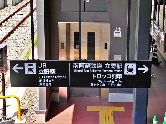 階段を降りたところを左へ行けばJRのホームで、右に行けば南阿蘇鉄道のホームになっています。表示板の奥にはエレベーターの扉が見えていますが、体の不自由な人や大きな荷物を持った人などは階段を降りずに、このエレベーターを利用できるんでしょうね。