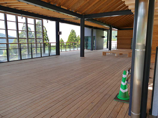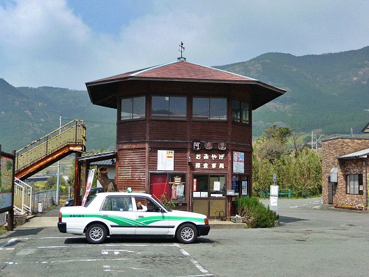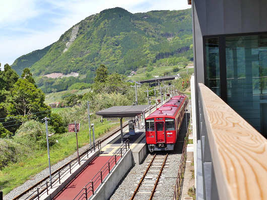画像の右側が階段になった表玄関になります。駅舎には県産材がふんだんに使われていて、阿蘇の玄関口にふさわしい木の温もりを感じることができるとても雰囲気のいい駅舎でした。
