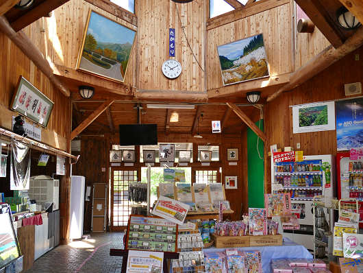 旧駅舎の中にも入ってみました。この駅舎は木造で温もりのある山小屋風の雰囲気がする素敵な駅舎ですね。この時はまだ営業をしていたのでお土産品などが並べられていましたが、この駅舎は南阿蘇鉄道のシンボル的な存在なので、新駅舎の運用が始まって役目を終えても保存することはできないものでしょうか?