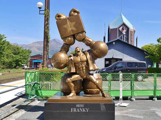 そして以前このブログでも紹介した麦わらの一味の「フランキー像」も元の位置のままで建っていました。ここはちょうど新駅舎の入口になりますが、この像を建てる時にはすでに新駅舎の設計などは決まっていたんでしょうね。フランキー像の後ろには古い駅舎も見えていますが、駅員さんの話では古い駅舎は木造で老朽化しているので解体される予定だと言っていました。