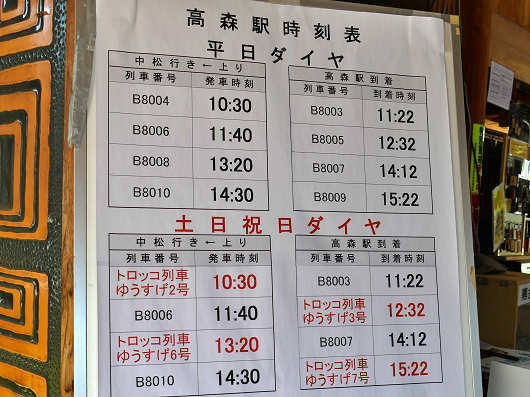 駅舎内には時刻表も掲示されていました。これを見るとトロッコ列車は土日祝日のみの運転ですが、今回は普通列車の新型車両を見るのが目的なので、10時30分発の始発車両を見物する予定です。