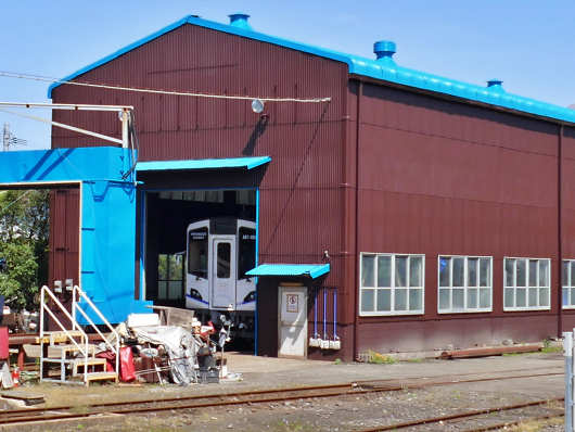 ホームで始発列車が来るのを待っていると、定刻になってやって来たのは、やっぱり旧型の車両でした。向こうの車庫内には新型車両が見えているのに残念ですねぇ~