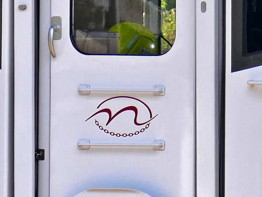 気動車の正面に描かれていたロゴマークです。南阿蘇鉄道の頭文字の「m」にしては「n」みたいだな?とこの時は思いましたが、帰ってから調べたら南阿蘇鉄道の略称が「南鉄(なんてつ)」なので、頭文字の「n」を描いているそうでした。そして「n」の文字を阿蘇五岳に見立てて、上の曲線は外輪山をイメージし、下の数珠繋ぎになった円形は南鉄が全線開通して10駅が繫がったことを意味しているそうです。