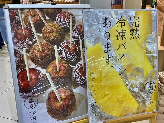 店頭にはフルーツ以外にも完熟冷凍パインや、最近流行りのりんご飴などもありました。