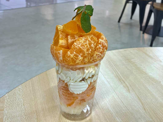 これがりゅうママの買った「みかんパフェ」です。上には甘いみかんが乗っていて、底のほうにはちょっとジャリっとするような冷凍みかんが入ったとてもあっさりしたパフェでした。