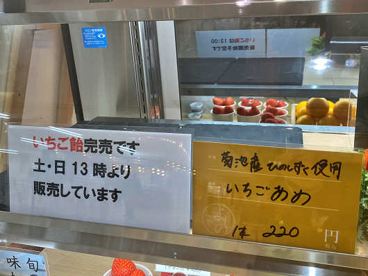 りゅうママはイチゴが大好物なので、最初はここでいちごパフェを食べるつもりでいたんですが、この日はいちごパフェの提供が無かったので、諦めていちご飴でも買おうとショーケースを見たら・・・