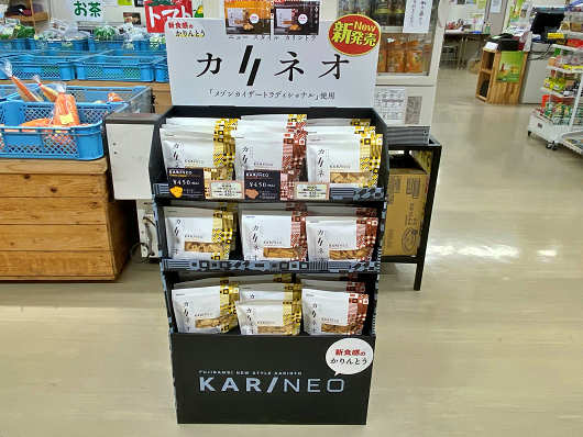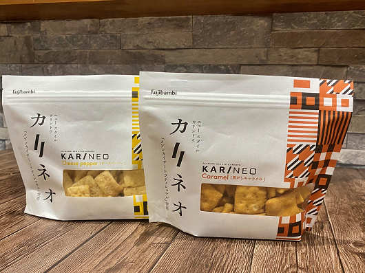 これが道の駅 すごう で買った「カリネオ」のチーズペッパー味と焦がしキャラメル味です。袋の裏を見たら「フジバンビ」と書かれていました。「かどの駄菓子屋 フジバンビ」といえば創業が昭和23年の老舗菓子店で、黒糖ドーナツ棒が有名で熊本県では知らない人がいないほど有名ですが、「カリネオ」はここの新商品で、かりんとうを平らにしたようなお菓子で、新しいかたちのかりんとうと書かれていました。とても美味しかったので、次にここへ寄ったらまた買ってみたいですね。