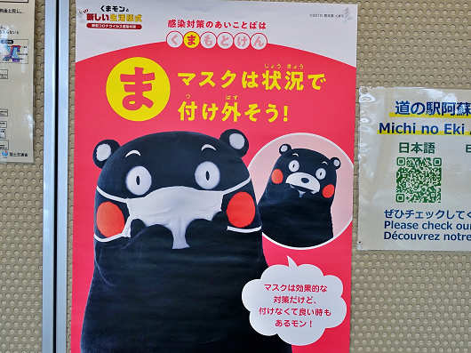 国道57号へ出たら、トイレ休憩を兼ねて「道の駅 阿蘇」に寄りましたが、トイレの入口付近には掲示板があって、この様なポスターが貼られていました。来月の13日からはマスク規制が緩和になって、何年振りかにコロナ以前の日常が戻って来るんですね。