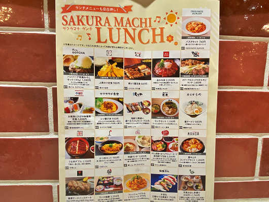 サクラマチ クマモトにはたくさんの飲食店が入っていて、入口で飲食店の載ったチラシも貰えますが、画像に写っているのはチラシの片面だけで、裏面にもたくさんの飲食店が載っていました。