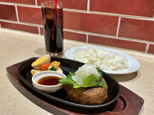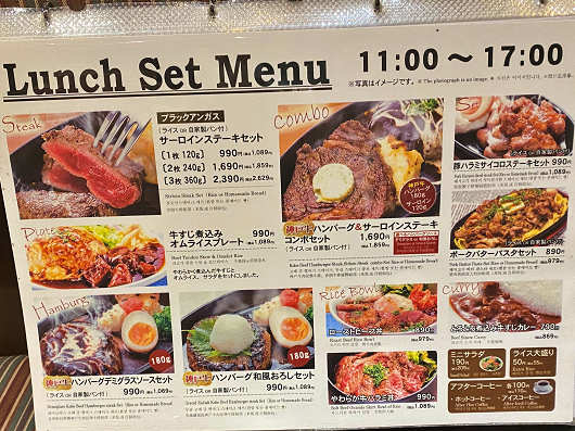 席に座ったら料理の注文ですが、私たちはランチメニューの中から料理を選びました。りゅうママはブラックアンガスのサーロインステーキセットを、私は神戸牛のハンバーグ和風おろしセットを注文しました。