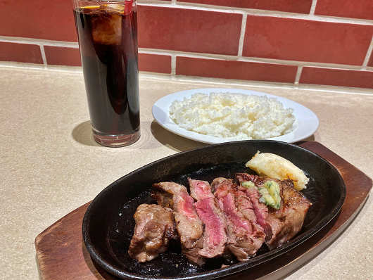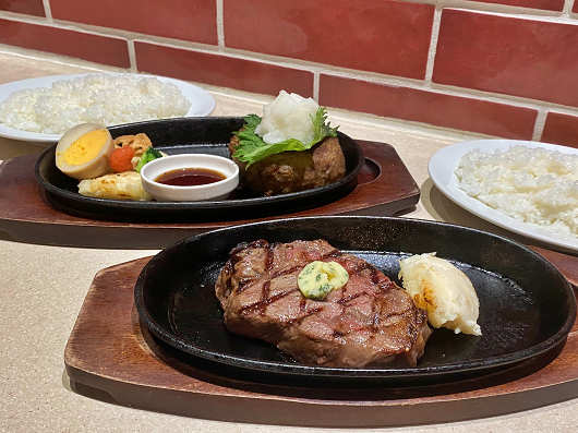 しばらく待っていると料理が運ばれてきました。手前がりゅうママの注文した「ブラックアンガスのサーロインステーキセット」で、奥が私の注文した「神戸牛のハンバーグ和風おろしセット」です。お店にによってはステーキを大きく見せるために、薄くして大きく見せているところもありますが、ここのステーキはかなり厚みがありました。