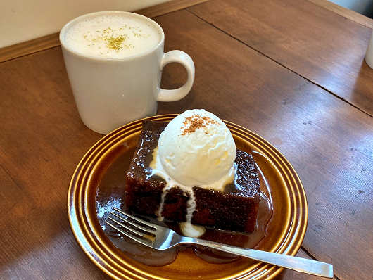 これはりゅうママが注文した(食べた)スティッキー トフィー プディングと、ほうじ茶のカモミールラテの砂糖抜きです。何だか舌を噛みそうな名前のスイーツですが、一口食べたらお味はとっても美味でした。