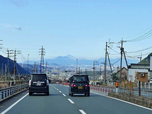 阿蘇盆地を熊本市方面へ抜けるには、従来からの立野経由の国道57号と、熊本地震後に新たに開通した北側復旧ルートの自動車専用道路の国道57号、そして外輪山を越えるミルクロードの3つのルートがありますが、今回は立野経由で阿蘇盆地を抜けると、正面には道中の雪景色がウソのように晴れ渡った空と大津町の街並みが見えてきました。