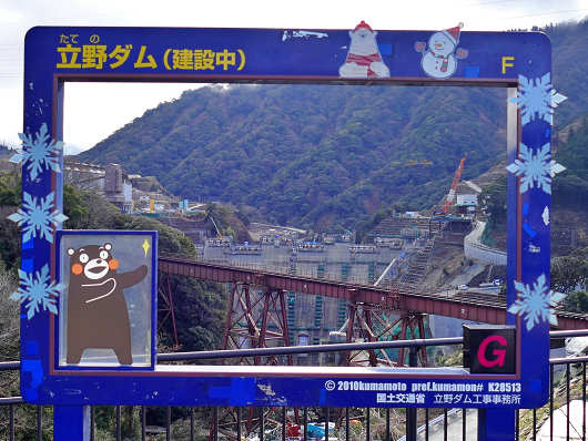 阿蘇盆地を抜けて最初に寄ったのは立野ダム展望所です。ここには撮影用のパネルがあって、季節ごとに枠の絵柄が変わりますが、厳冬期のこの時季は雪の結晶や雪だるまが描かれていました。