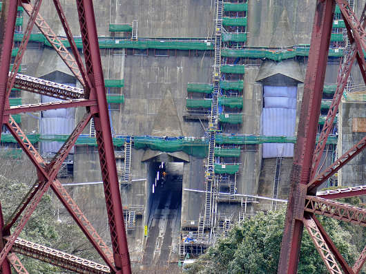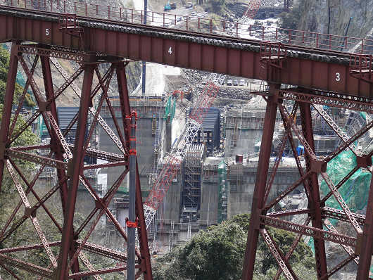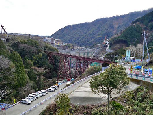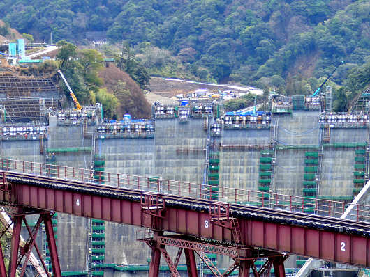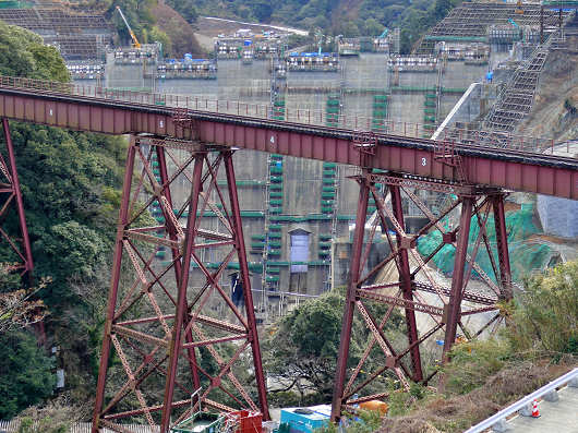 ここを最後に訪れたのは昨年の8月なので、今回は5か月ぶりの訪問になりますが、今回訪れてみるとダムの本体工事がかなり進んでいて、手前にある鉄橋よりも上のほうまで堤体が伸びていました。