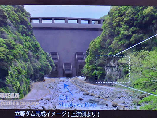 この説明板には立野ダムの完成イメージもあるので、この写真と現在の立野ダムの姿を見比べてみました。