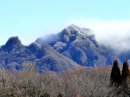 快晴の天気で周辺には残雪も全く無いのに、山の頂上付近の樹木だけが白くなった幻想的な光景が見えてきました。これって樹氷なんでしょうか?周囲のちょっと低い山々の樹木は全く白くなっていなかったので、標高が高くなると気温が下がるのがよく分かる光景ですね。