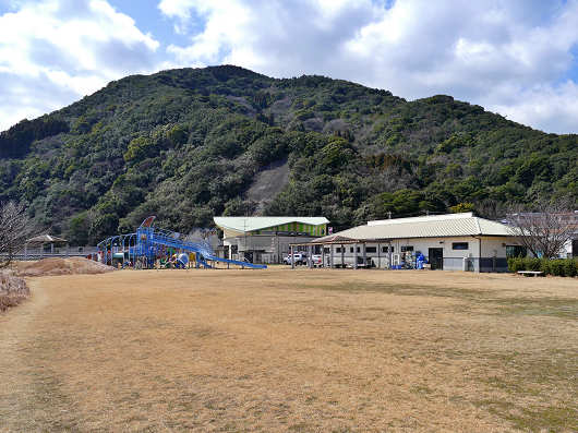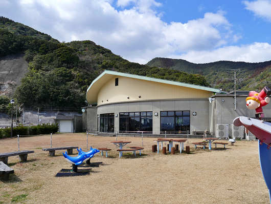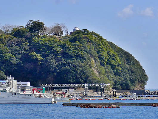 そして北側の津久見市方面を眺めると、山の上には球形をしたシルバーの構造物が見えました。これは「かみうら天海展望台」にある天体望遠鏡ですが、残念なことに現在は故障で利用できないそうです。そしてこの山の向こう側には敷地内に立てられていた標識に書かれていた海水浴、キャンプ施設などのある「瀬会公園(ぜあいこうえん)」があります。